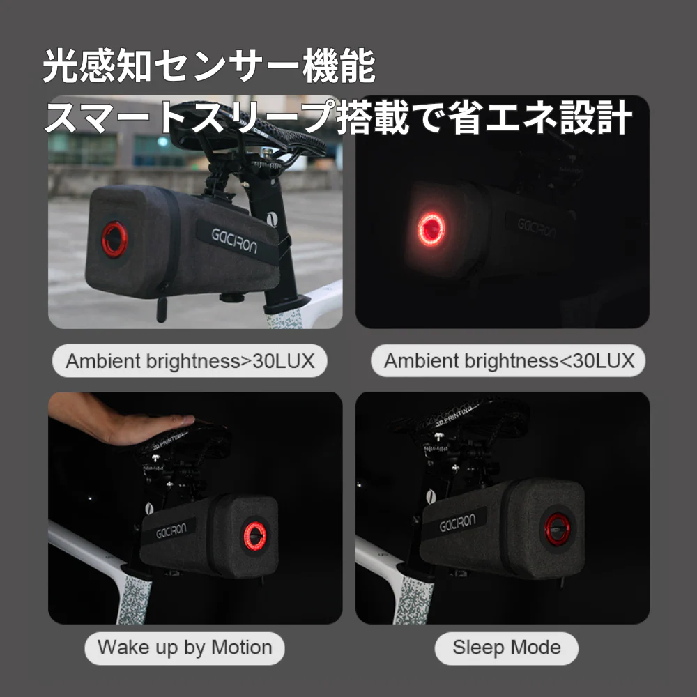 ・スマートスリープモード:電源が入った状態で約120秒間動きがない場合、自動的にスリープモードに移行。再び動き出すと、直前のモードで自動的に点灯を再開します。余計な操作が不要で、停車中の電力消費も抑えられます。