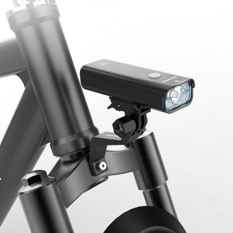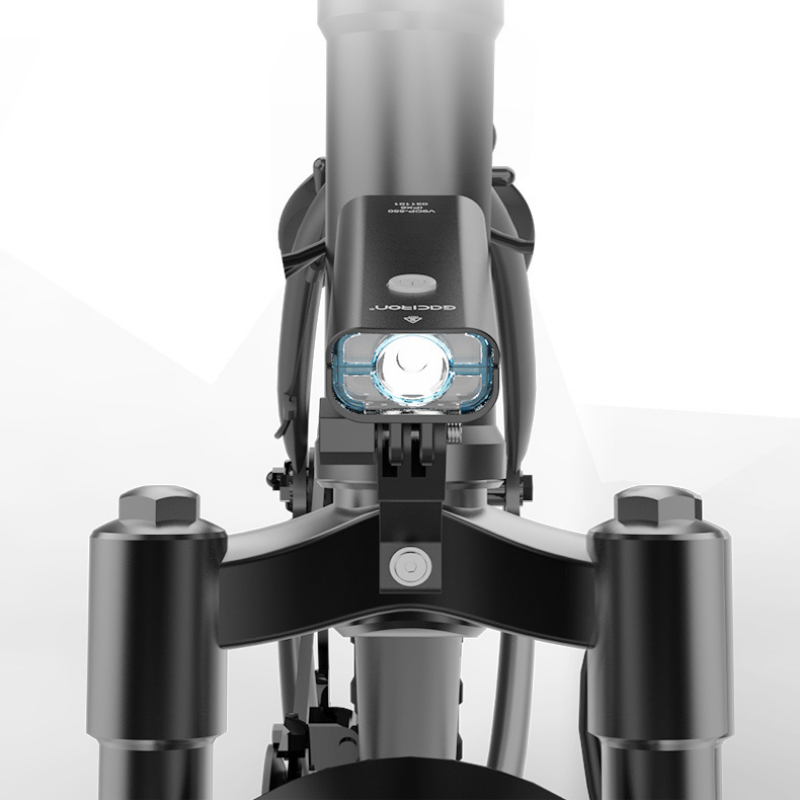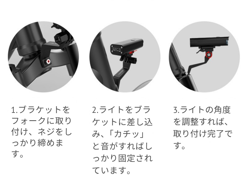・自転車のフロントフォーク用に設計:フロントホイールの上にヘッドライトを取り付ける、ユニークな固定方法です。