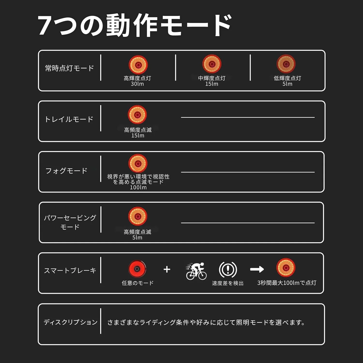 ・7つの動作モード: さまざまなライディング条件や好みに応じて照明モードを選択します。